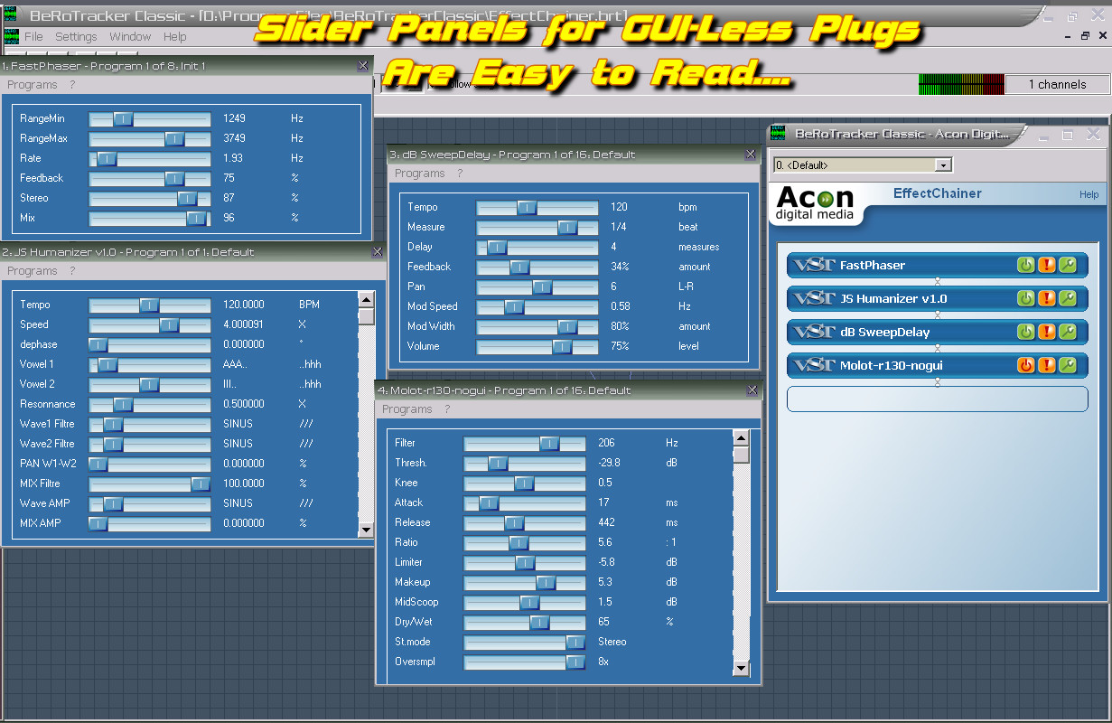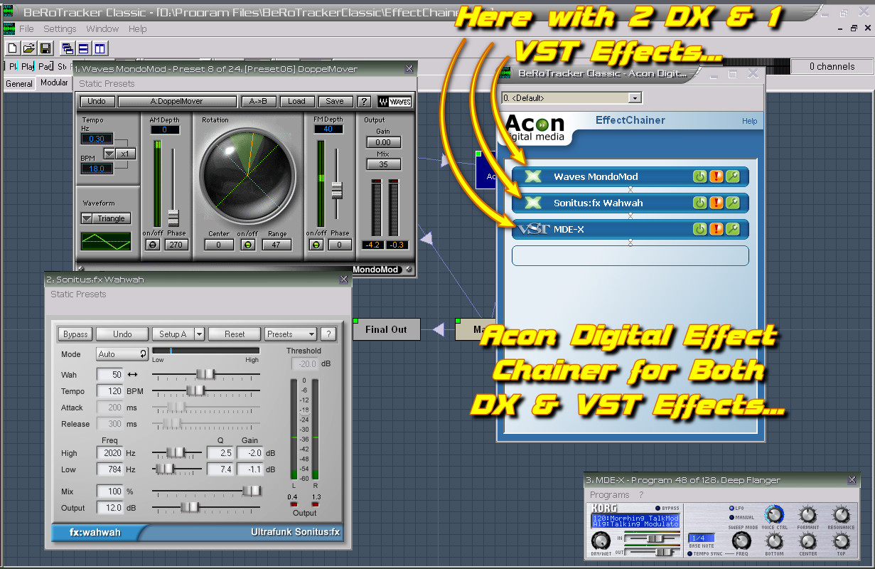 Got any DX plugs you’d like to combine with VST? This freeware chainer from Acon still can be grabbed on the wayback… Doesn’t work in every host but some like it, I use it in BeRoTracker Classic…