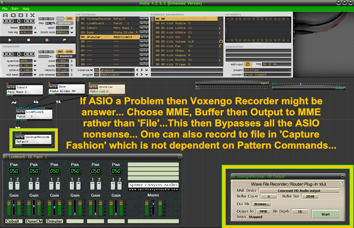 One problem with Aodix is the ‘ASIO Only’ aspect… What if ASIOs not working on a machine at all or there’s poor integration with Aodix & a particular ASIO?… I simply eliminate Aodix output altogether & route to Voxengo Recorder which will either record audio or divert to MME driver…