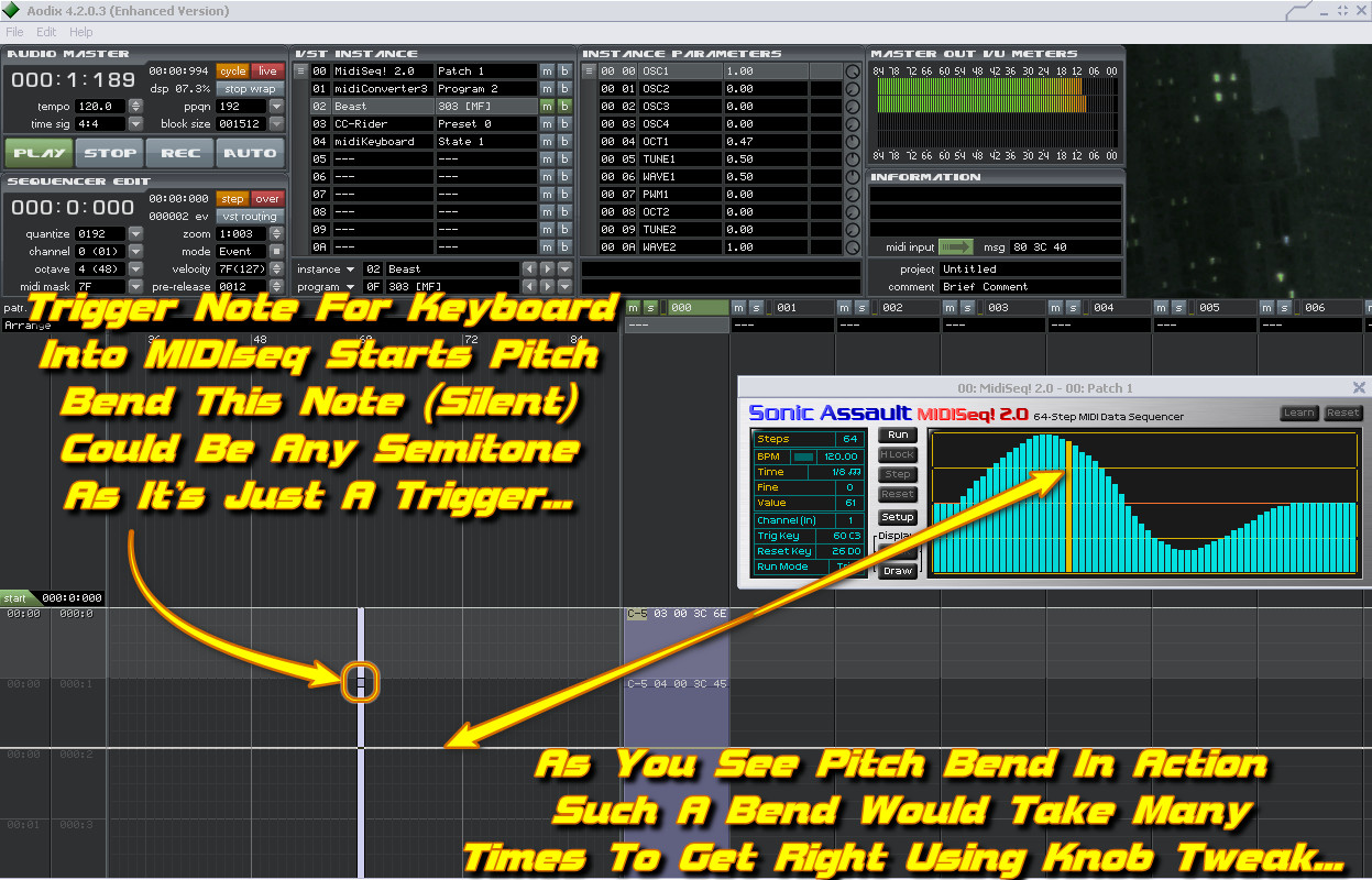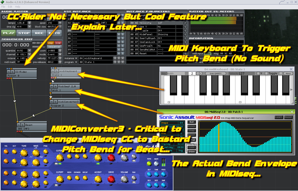 Neither CC-Rider nor MIDIConverter3 have GUIs but here anywhere in the tune I place a very short trigger note the MIDIseq will run creating exact same pitch bend quite adjustable to get ‘just right’… doesn’t matter what note beast is playing this could also be hooked up in tandem with another instrument so it had same pitch bend as Beast if doing some unison sort of thing…