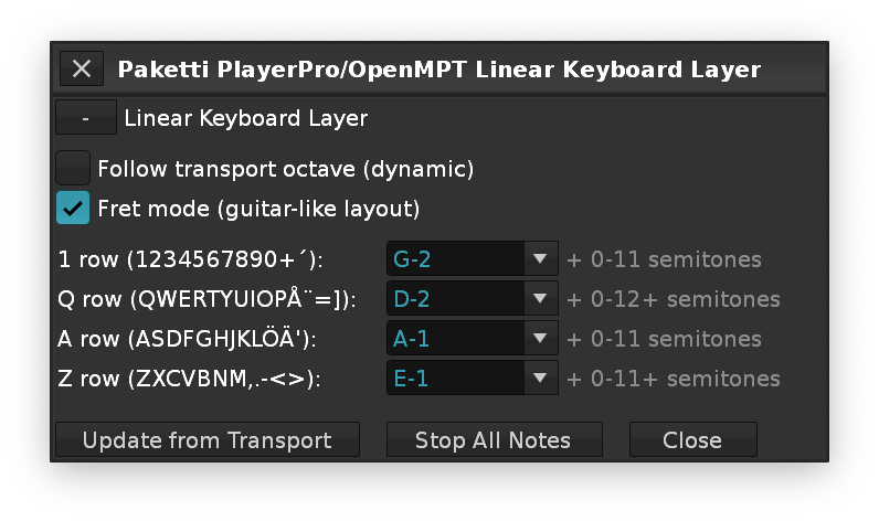 - For those like me who are more accustomed to the fret layout of guitars and basses than piano keyboards, it becomes possible to input using an arrangement where Z corresponds to E-2, A to A-2, Q to D-3, and 1 to G-3, then progressing in semitones to the right from there.