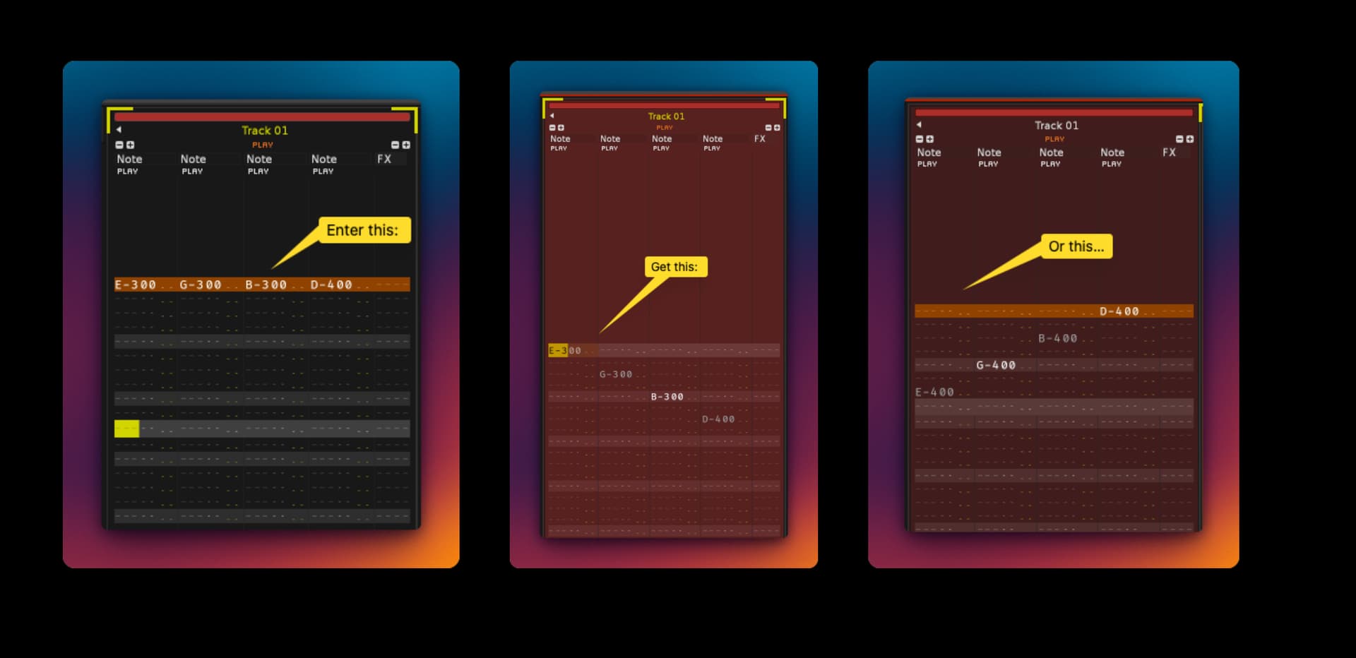 I would like to input a chord on one line of the pattern editor and then easily convert it to an arpeggio by moving the notes to different lines in the pattern editor.