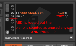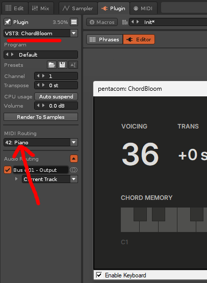 hi @ChokoSnap - when you say it is routed to a piano (2A) - is the data within the VST3 ChordBloom device, or is it somehow in the Plugin Settings in Renoise?