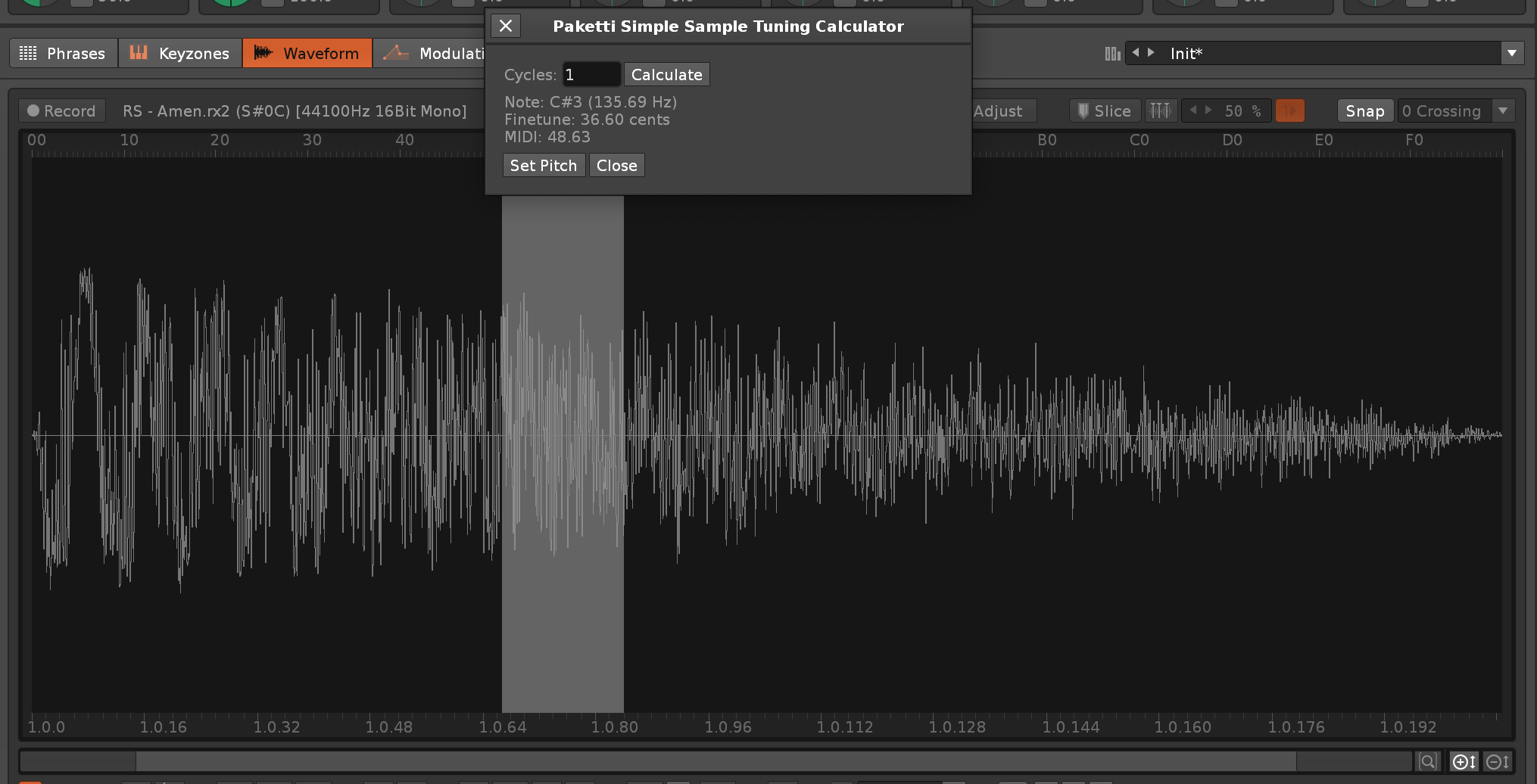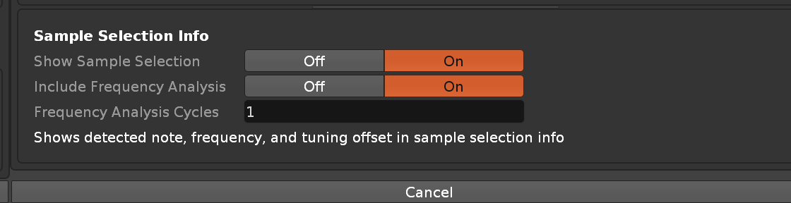 To make the sample selection info more useful for me, would be to have frequency in Hz and note translation A4, C3, D#5 et cetera + perhaps semitone values if the pitch is slightly off? Could be handy when making a selection in a sample to crop and have info about the tuning.