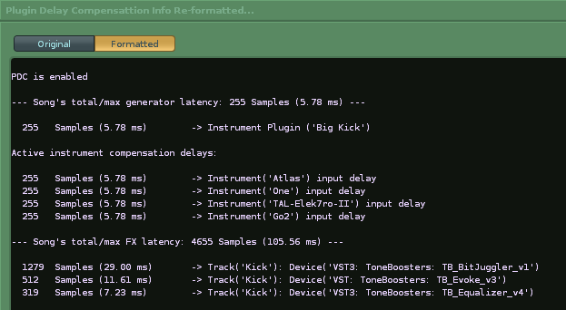 Added a menu entry (Song menu in renoise) for a window you can paste the Plugin Delay Compensation info into and format it for clearer reading. Chatbot aided logic for the string manipulations so testing/ feedback welcomed.