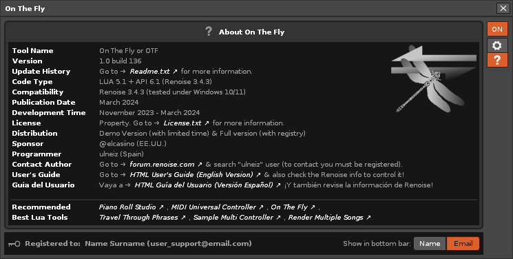 The following control program is a single window tool exclusive to the Renoise DAW (64 bit, v3.4.3) or future versions. Generally, it is designed for integration and massive control with the MIDI input (or commonly known as “MIDI routing”), through a USB MIDI controller (or several) of Pad type or similar, mainly focused on live playback of the song, as well as for sound control for live changes, for creativity in real time. On The Fly is designed for use on stage, for performing live shows based on song projects composed especially for it and designed for the vast majority of USB MIDI devices on the market, being very flexible in this sense, especially for large or small size PADs, small 2 or 3 octave keyboards and devices with wheels and pads, as well as medium or large MIDI keyboards with some additional control knobs…