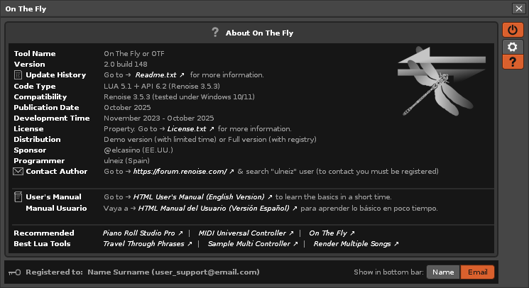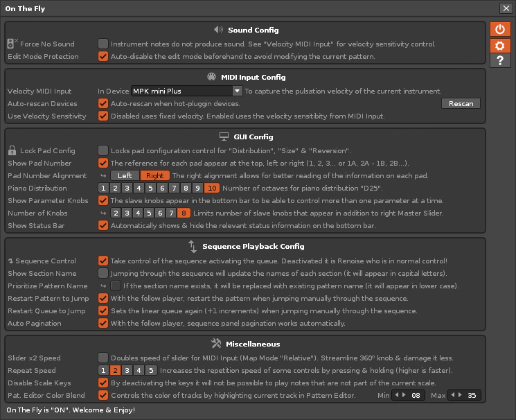 The following control program is a single window tool exclusive to the Renoise DAW (64 bit, v3.5.3) or future versions. Generally, it is designed for integration and massive control with the MIDI input (or commonly known as “MIDI routing”), through a USB MIDI controller (or several) of Pad type or similar, mainly focused on live playback of the song, as well as for sound control for live changes, for creativity in real time. On The Fly is designed for use on stage, for performing live shows based on song projects composed especially for it and designed for the vast majority of USB MIDI devices on the market, being very flexible in this sense, especially for large or small size PADs, small 2 or 3 octave keyboards and devices with wheels and pads, as well as medium or large MIDI keyboards with some additional control knobs…