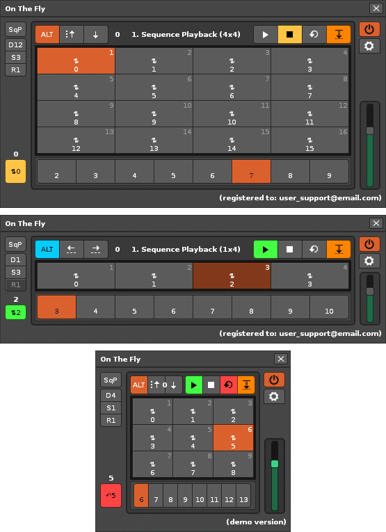 - Sequence control. The bottom bar shows the “sequence queue” with 8 slots that can be modified on the fly.