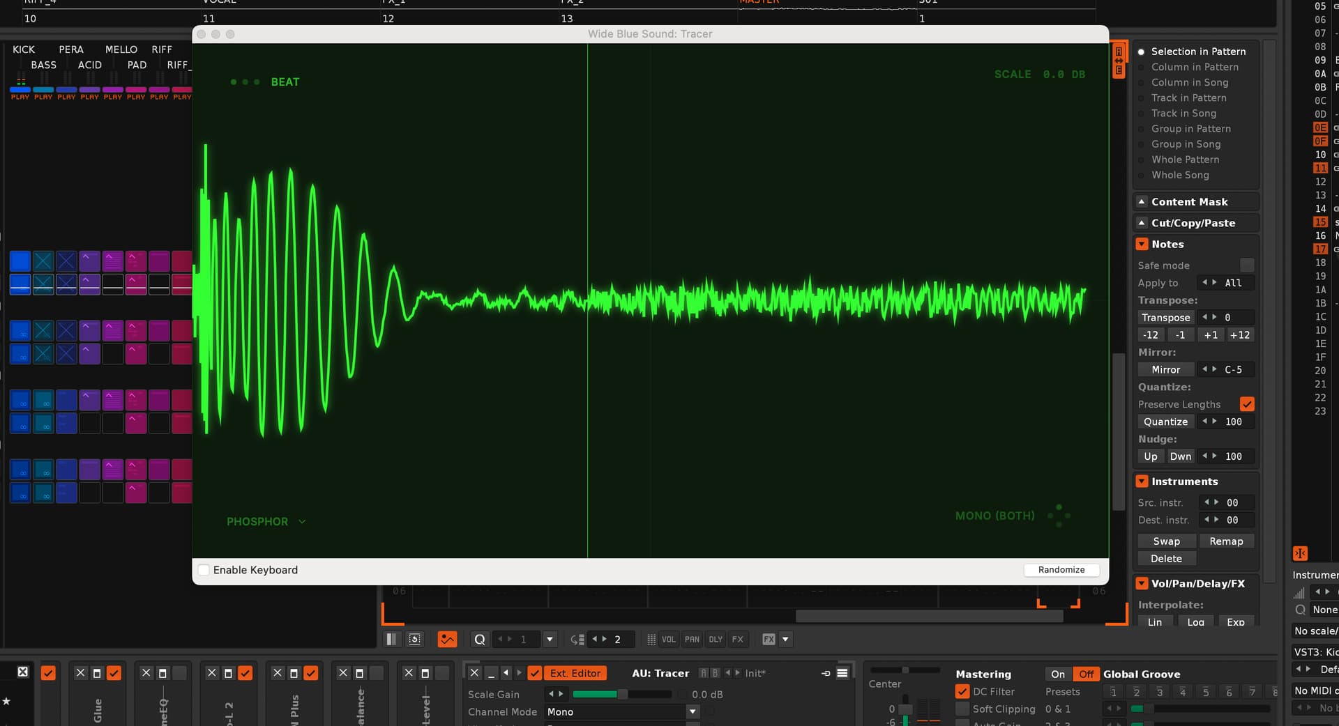 A Menuitem to show/hide on the Trackmenu (or on the Device) would be nice too! It comes as an FX device? Then it would be nice to if it react on deactivation with Enter key! The coolest thing would be to overide the entire Renoise oszilloscops window area with a custom canvas for this, but i think that are only dreams…