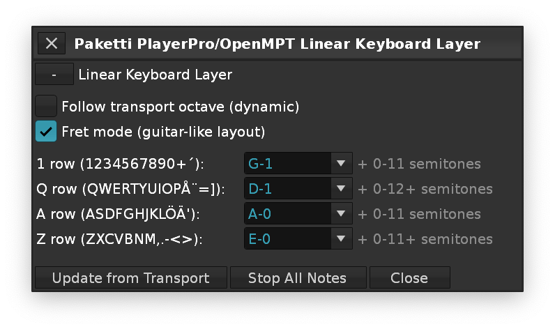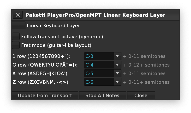 each of the 4 rows can be assigned to a different note to start from. they’re linear. so qwert is actually c-4 c#4 d-4 d#4 e-4 instead of what you’re accustomed to. there’s also a guitar-like layout: